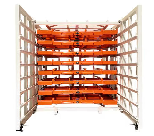 The underlying rack structure uses the same 8Layer Boltless Steel Corrosion Protected Powder Coated Heavy Duty 2T/layer design as the manual version. Boltless assembly means the rack ships as unassembled components that lock together using pre-punched tabs and spring clips. No welding and no loose fasteners required. The 8-layer configuration provides storage for up to 16 tons of sheet metal distributed across individual drawers. Each drawer measures 2500mm wide by 1300mm deep, accommodating standard 4×8 foot and 5×10 foot sheet sizes. The boltless connection system allows reconfiguration of drawer positions – an operator can relocate a drawer from the middle to the bottom position in under 10 minutes using only a rubber mallet.