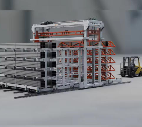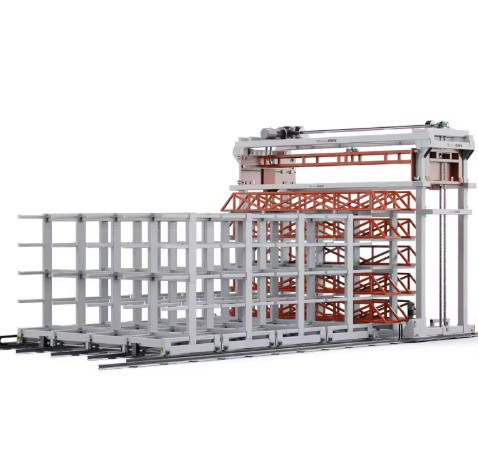 The system architecture consists of four primary components: a loading/unloading gantry system, profile material racks, material frames, and guide rails. Each component is designed not as an isolated machine but as a cooperating subsystem. The gantry robot serves as the central material transport mechanism, moving along the guide rails to access any position within the storage envelope. The profile material racks are the static storage structure, typically configured as a tower with 8 to 13 levels. The material frames are the removable or fixed supports that cradle specific profiles. Together, these components form a complete automated warehouse.