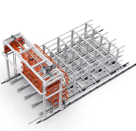 The gantry loading robot deserves special attention because it is the most dynamic element. Its structure is a bridge-type gantry fabricated from high-strength steel trusses. The truss design minimizes weight while maximizing stiffness—essential for positioning accuracy under varying loads. The robot travels on linear guide rails mounted to the floor or to elevated beams, depending on the warehouse configuration. Travel length can exceed 30 meters in large installations. All three axes (horizontal travel, vertical lift, and fork extension) are servo-controlled and synchronized to enable coordinated motion paths.