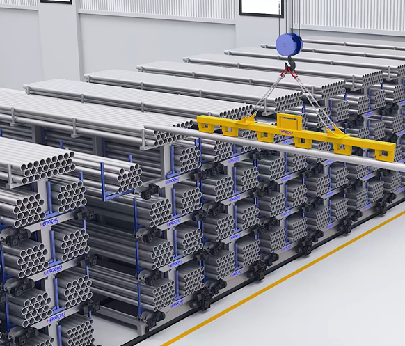 For pipes and tubes, the cantilever arms can be fitted with optional saddles or V-shaped supports that prevent cylindrical goods from rolling. The telescopic action allows a single layer to be extended, meaning the operator can access a specific diameter of pipe without disturbing the bundles above or below it .